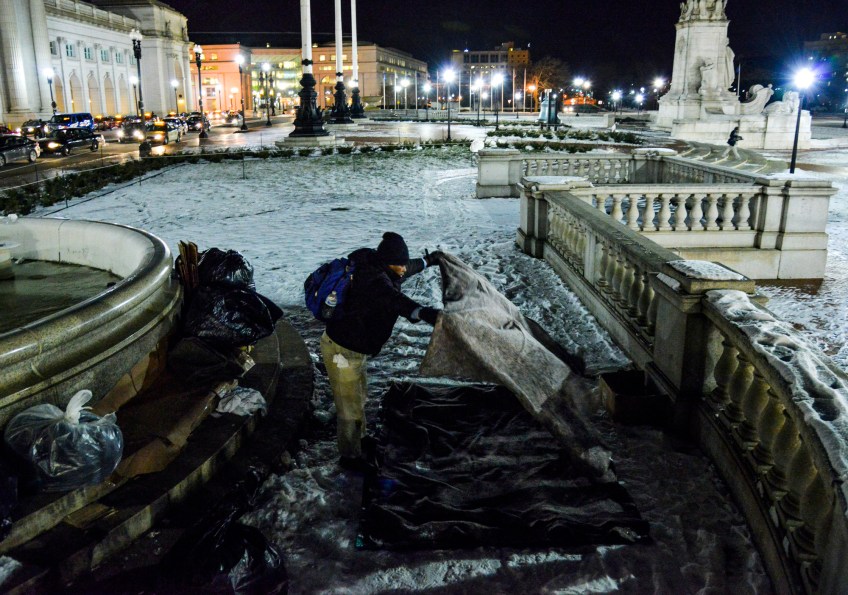 HM LIFESTYLE: Jahi Chikwendiu, Washington Post—As temperatures plunged to feel like almost zero degrees, a homeless man who wishes not to be named prepares his bed for the night outside a busy Union Station, on January 8, 2015, in Washington, DC. As the first serious cold for 2015 hit the district, the city activated its Cold Emergency Plan to protect homeless and at-risk residents who wished to accept the offer of warm shelter.