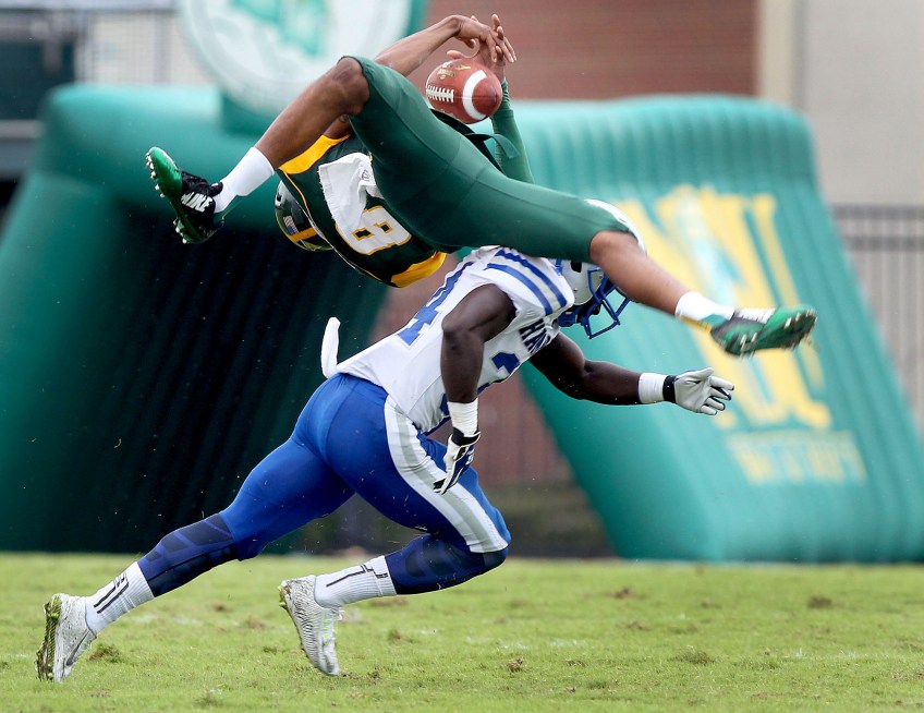 Norfolk State 24, Hampton 14 Published March 6, 2016 at 2000 × 1543 in The VNPA 2015 Contest Winning Singles HM SPORTS ACTION: Rob Ostermaier, Daily Press—Norfolk’s DeAndre Sangster manages to hold onto this first quarter pass for a first down as he is hit by Hampton’s Chaka Diarrassouba Saturday September 26, 2015 in Norfolk.