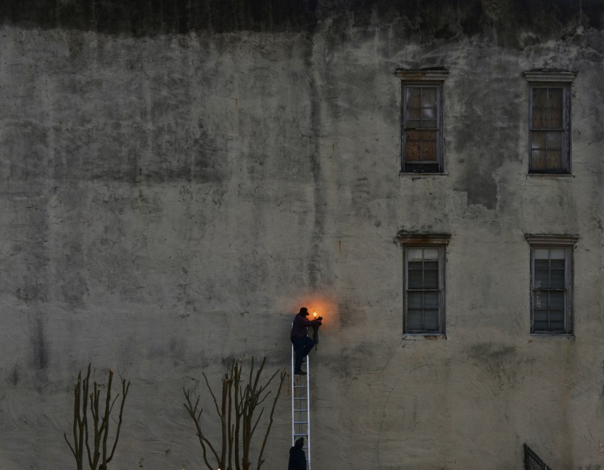 HM PICTORIAL: Jahi Chikwendiu, Washington Post—Ledell Tenner, 59, on ladder, and Frank Murry, 54, both electricians with the city of Selma, change lights and their fixtures at the foot of the historic Edmund Pettus Bridge in preparation for the 50th anniversary of the Bloody Sunday civil rights march, on March 3, 2015, in Selma, AL.