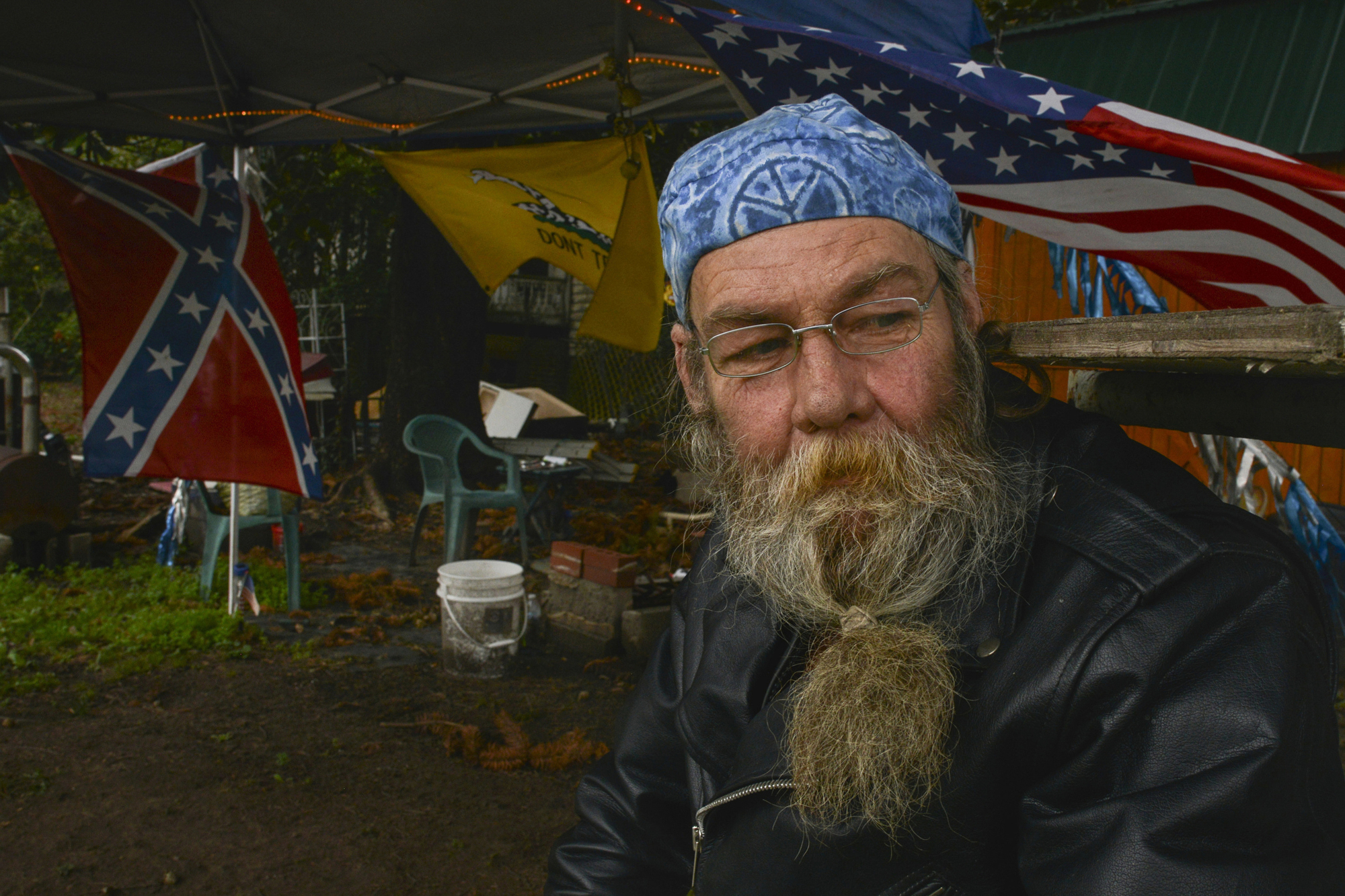 2nd PLACE PORTRAIT: Jahi Chikwendiu, Washington Post—Gordon Corley, 57, sits outside his wife’s biker apparel shop in Maplesville, AL. Corley explained the meaning to him of each of the three flags that flew behind him. “The American flag, that’s our country, that’s our heritage. It doesn’t matter what color our skin is. We all come from America…Don’t tread on me, that’s the Marine Corps…Far as the rebel flag, that’s just the south. That’s just the heritage of the south.”