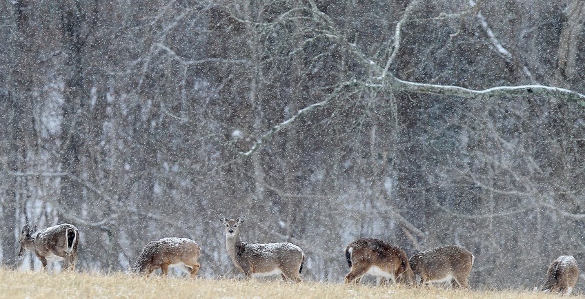 3rd Place Environment/Nature: Rob Ostermaier, Daily Press–A large group of deer graze as a steady snow comes down on a field near Endview Plantation in Newport News. Deer populations near Newport News Park and the plantation have exploded because no hunting is allowed and a lack of natural predators.