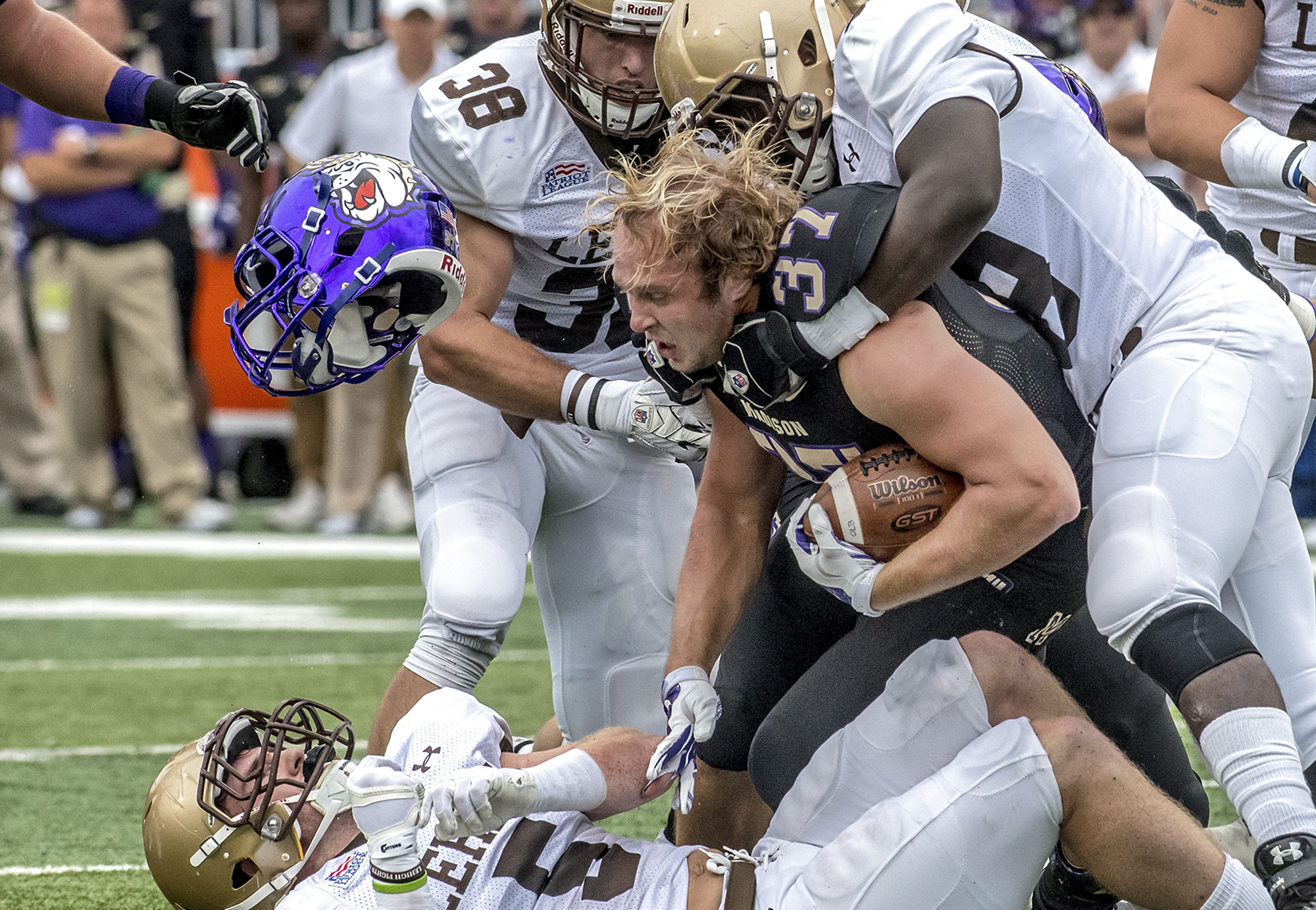 1st PLACE SPORTS ACTION: Austin Bachand, Daily News Record—James Madison University r-senior Deane Cheatham (37) looses his helmet as he gets taken down by the Lehigh defense during their game at JMU’s Bridgeforth Stadium on Saturday, September 12, 2015.