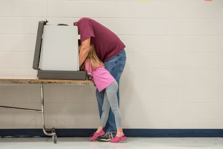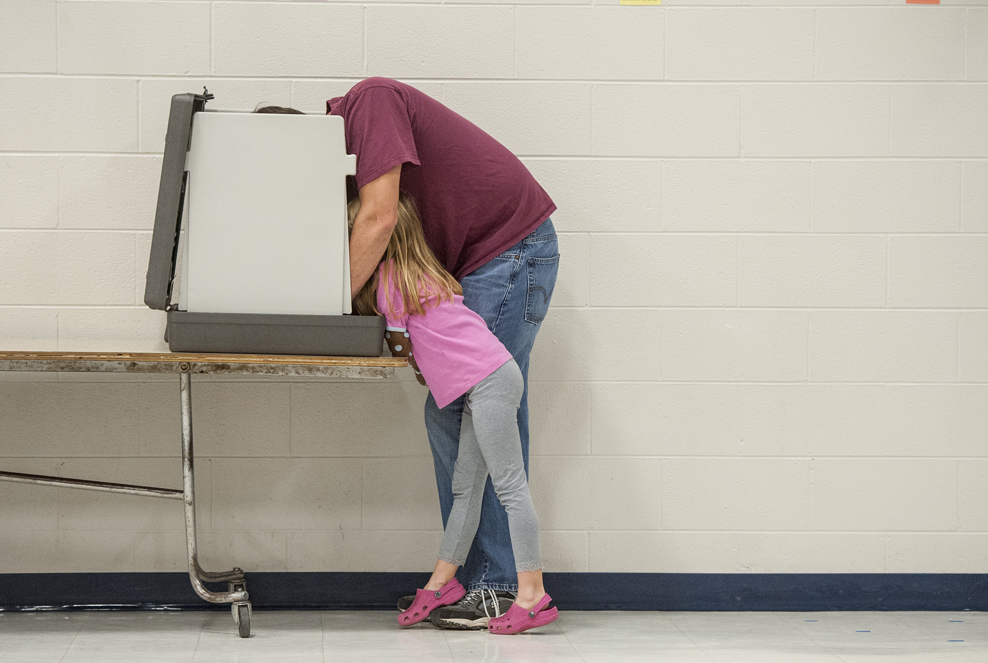 voting Published March 6, 2016 at 2000 × 1343 in The VNPA 2015 Contest Winning Singles HN GENERAL NEWS: Daniel Lin, Daily News-Record—Bryan Kiracofe, of Briery Branch, casts his vote on election day with some help from his daughter Chloe, 6, at the Ottobine Elementary School voting location.