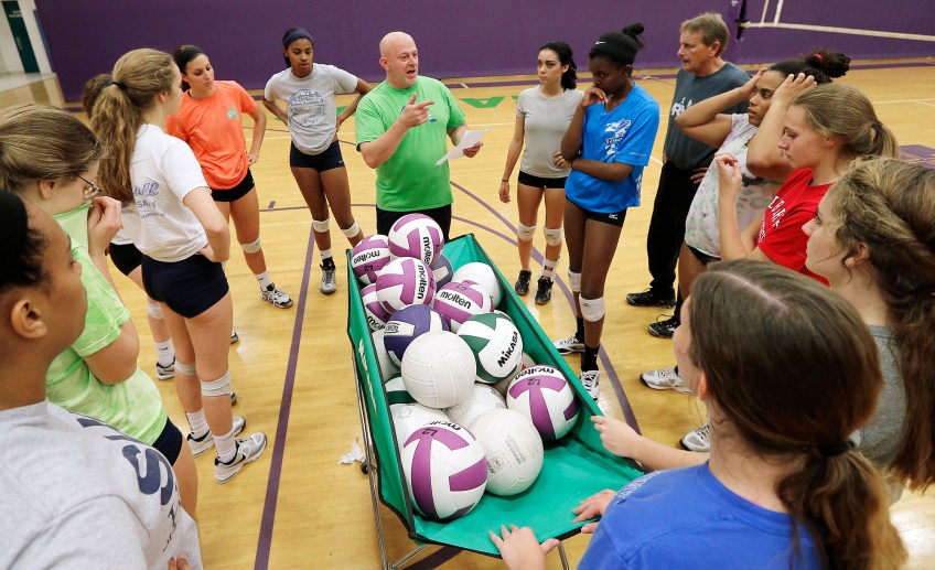 Sps-010-coachprosthetist-08 Published March 6, 2016 at 2000 × 1220 in VNPA 2015 Contest: Sports Picture Story James River Head Coach Joe Sullivan, middle, goes over some pointers with his volleyball team during practice.