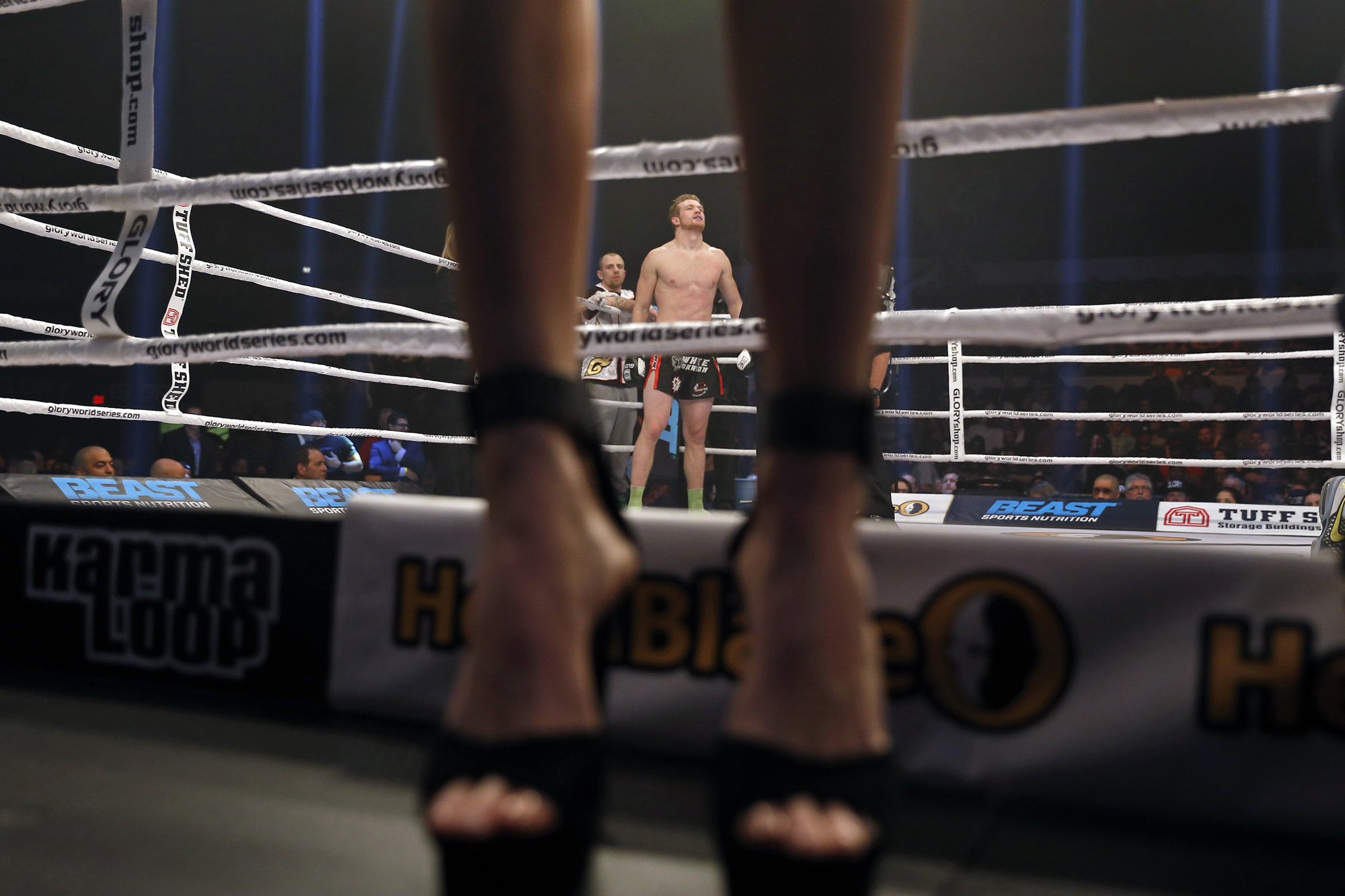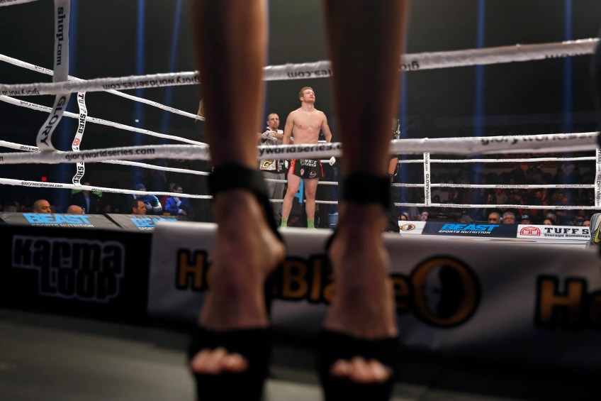 Robert Thomas waits inside the round in between as women carrying the round number in identify the current round pass by before the start of the match against Joe Schilling during Friday’s co-headline event presented by Glory Sports International at the Hampton Coliseum.