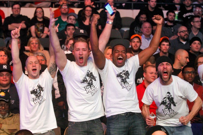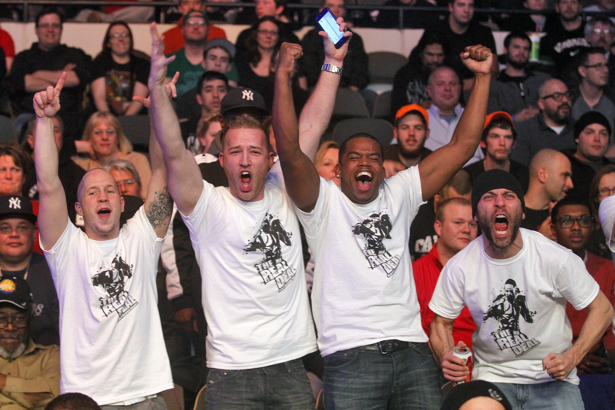 sps-022-kickboxing-06 Published March 6, 2016 at 2000 × 1333 in VNPA 2015 Contest: Sports Picture Story Fans of Raymond Daniels cheer as he competes against Jonatan Oliveira during Friday’s tournament presented by Glory Sports International at the Hampton Coliseum.