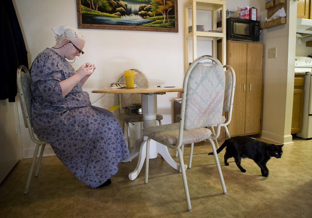 Tonya Davison, 36, eats some yogurt at he mom’s apartment in Keysville on Friday, Jan. 29, 2016. Since receiving her glasses, Davison can now do more activities independently and not stumble over her mom’s nine-year-old cat, Rachel. “I didn’t even know where Rachel the cat was laying on the floor. I would accidentally step on her. Now that I can see her, I haven’t stepped on her!” Davison said. “Now I can do things like regular people,” she said.