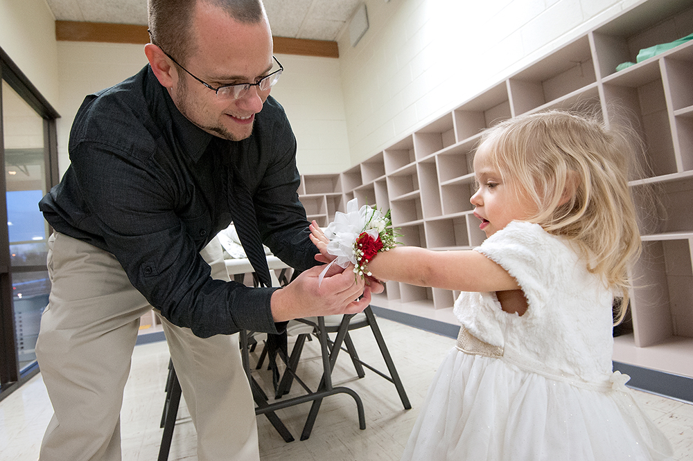 Eric Oberg, of Verona, Va., puts a corsage on his 2-year-old daughter, Alyssa, as they arrive to the annual Daddy Daughter Sweetheart Dance at the Cecil F. Gilkerson Community Activities Center Saturday night in Harrisonburg, Va., Feb. 6, 2016. It was the fourth year for the dance.