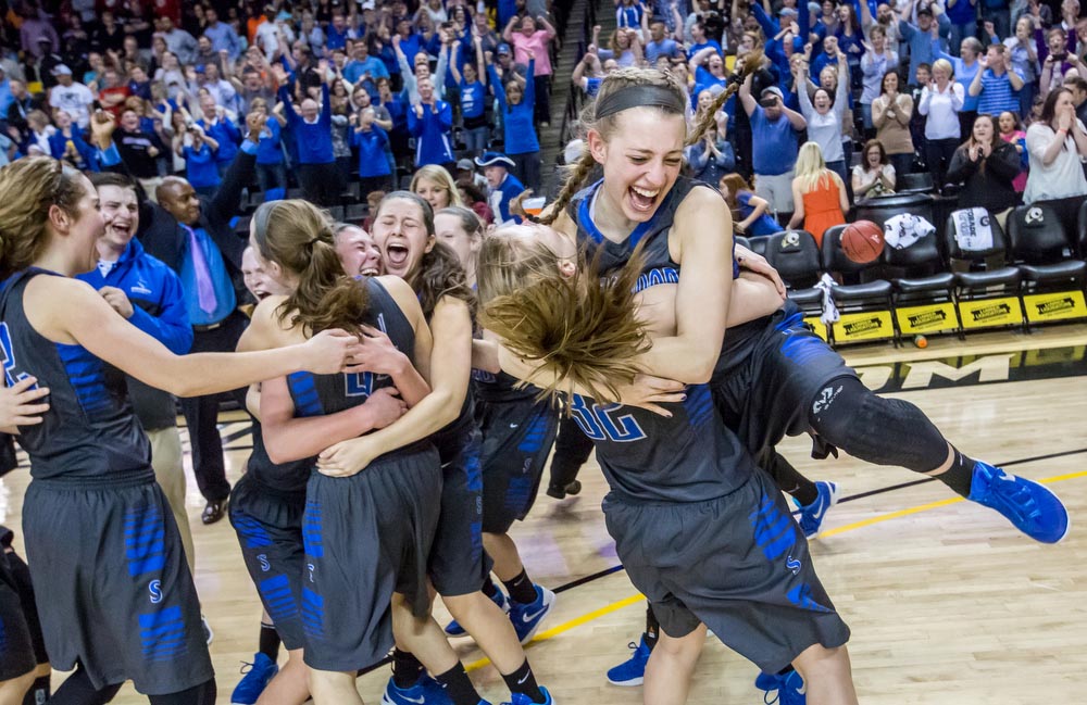 Spotswood sophomore guard Meredith Vetter jumps into the arms of her twin sister, sophomore forward Brooke Vetter as the team celebrates after winning their VHSL 3A state championship game against Magna Vista in Richmond, Va., Saturday, March 12, 2016.