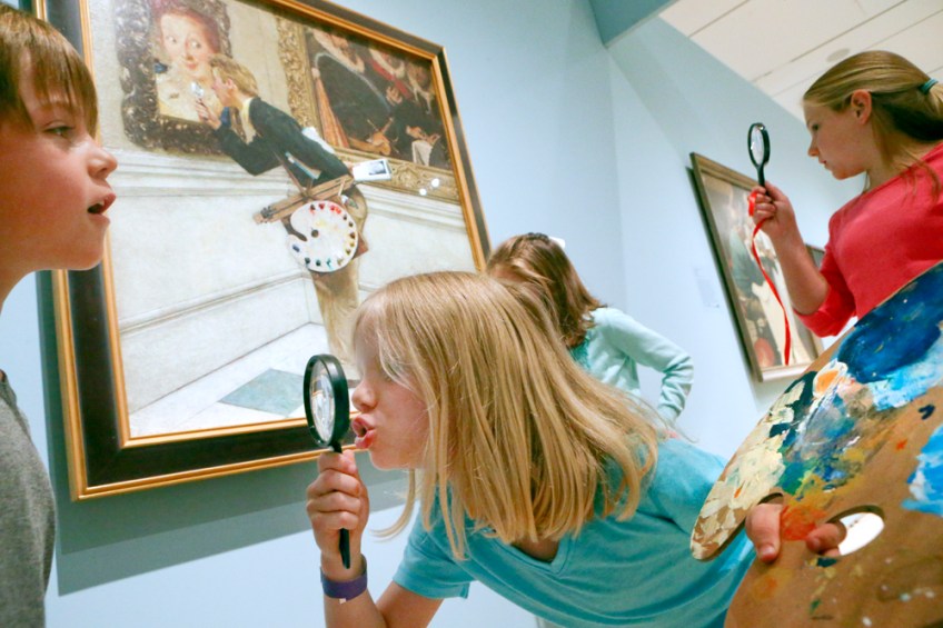 Maverick Johnston, 7, Naomi Lankford, 6, and Lydia Lankford, 10, reenact Norman Rockwell’s painting titled “Art Critic,” at the Taubman Museum on Wednesday. American Chronicles: The Art of Norman Rockwell is on exhibit at the museum until June 12. The homeschoolers from Botetourt County attend the museums children program and recreated scenes from the exhibit and even used props provided by the museum.