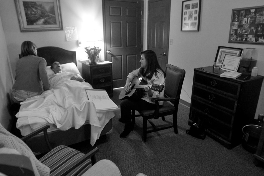 Multiple, 1st place, Jonathon Gruenke, The Daily Press (4) Published August 24, 2016 at 1000 × 667 in 2nd Q. CLIP CONTEST WINNERS 2016 Shelly Simonds plays guitar for Jim as he lies in bed at Commonwealth Assisted Living in Hampton Monday afternoon March 28, 2016. Jim died from Alzheimer’s April 2, 2016.
