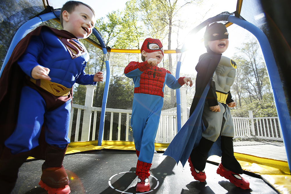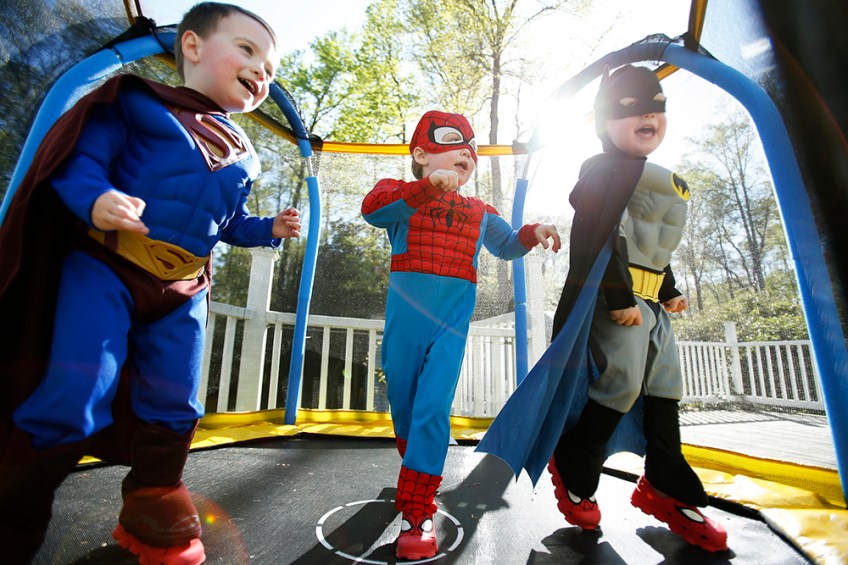 (From left) Finnegan, Brandon and James Brehony bounce on a mini trampoline on their back porch on Sunday April 17, 2016. The boys are triplets to first time parents Kate Bredimus and Matt Brehony. On the weekends the parents let the kids dress as their favorite super hero, and each boy has his specific favorite character.