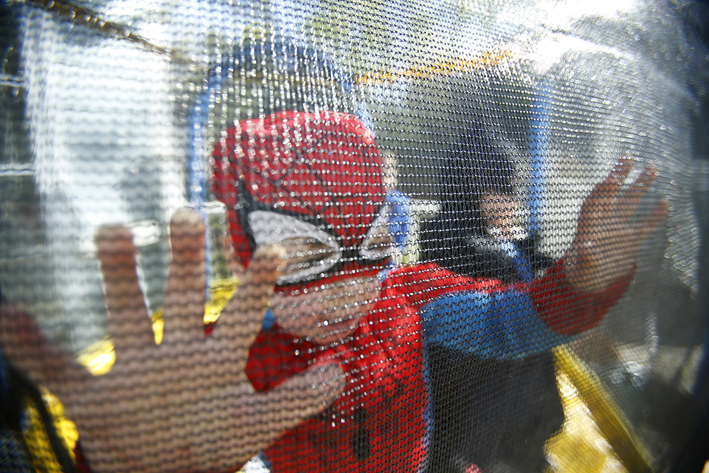 Brandon Brehony presses his hands up against the netting of a mini trampoline on Sunday April 17, 2016. He shouts out that he wants the Spiderman theme song to be played while they jump on the trampoline. Brandon is a triplet to first time parents Kate Bredimus and Matt Brehony.