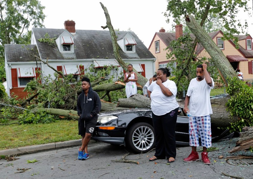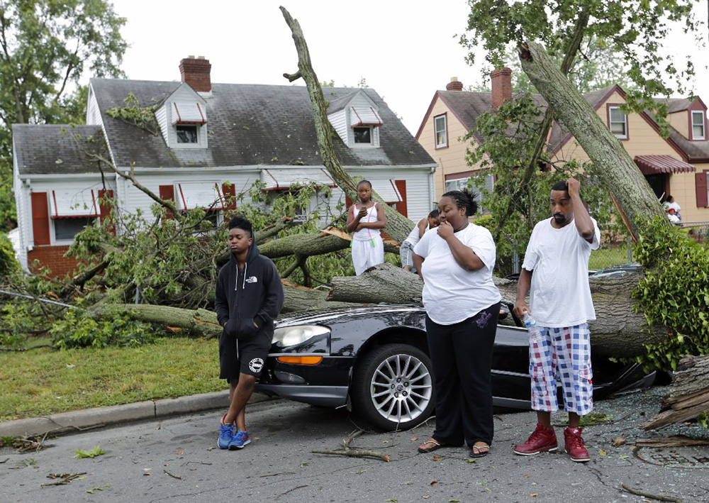 Ameyah Graves (far left) couldn’t believe that her mother’s car was totaled by a fallen tree during Thursday night’s storm. She and neighbors along Patrick Avenue lost their power. From left: Ameyah Graves, Jamya Mobley (11), Aquan Mobley (7), their mother Audreyel Mobley and Audreyel’s husband, Jonas Baptist. June 17, 2016.