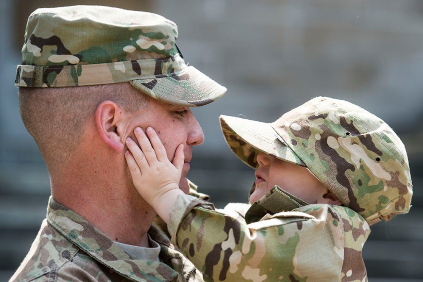 LYNCHBURG, VA – MAY 15: Benjamin Melin, 2, squeezes the face of his father, Captain Ben Melin, left, Company Commander of HHC 1-116 Infantry, Army National Guard, after a ceremony for the deploying unit at Monument Terrace on Sunday, May 15, 2016 in Lynchburg, Va.