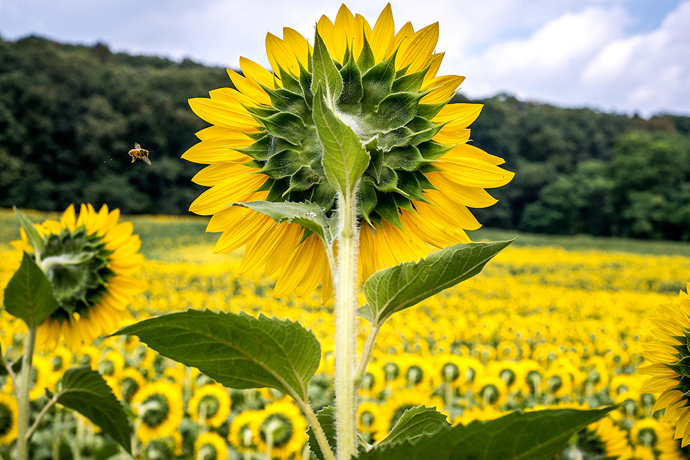 feature-hm-austin-bachanddaily-news-record Published December 7, 2016 at 1000 × 667 in 3rd Q. CLIP CONTEST WINNERS 2016 (8/25/16) – (Harrisonburg) A bee flies to a sunflower as the field of sunflowers sits next to the intersection of US 33 and Stone Spring Road on Thursday, August 25. (Austin Bachand / DN-R)
