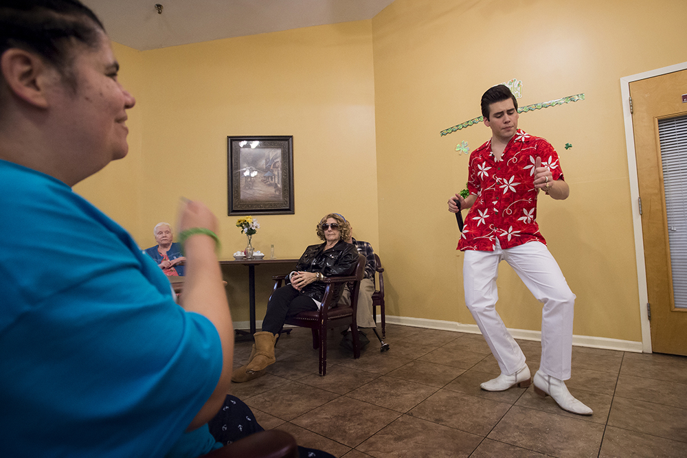 Taylor Rodriguez performs at Carriage Hill Assisted Living. The Assisted Living facility was the first assisted living to hire Rodriguez and he still tries to go back and perform often, sometimes once a month. ÒThey mean a lot to me too,Ó he says. ÒThe people there, IÕve known since I started. They saw me improve and improve – which I hope I am improving.Ó