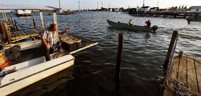 Rudy Shores waves to a passing boat while he works from his work shanty in the evening of Wednesday, Aug. 10. Local watermen make a living crabbing for Chesapeake blue crab in the summer and oysters in the winter.