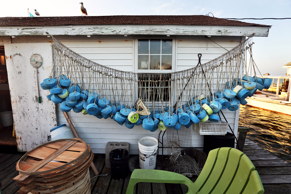Colored crab pot buoys hang from a line outside of the mayor’s work shanty off Tangier Island. The island is a working watermen village which draws leagues of tourists ferried in from the mainland every summer for fresh, locally caught Chesapeake blue crab and laid-back lifestyle. Wednesday, Aug. 10, 2016.
