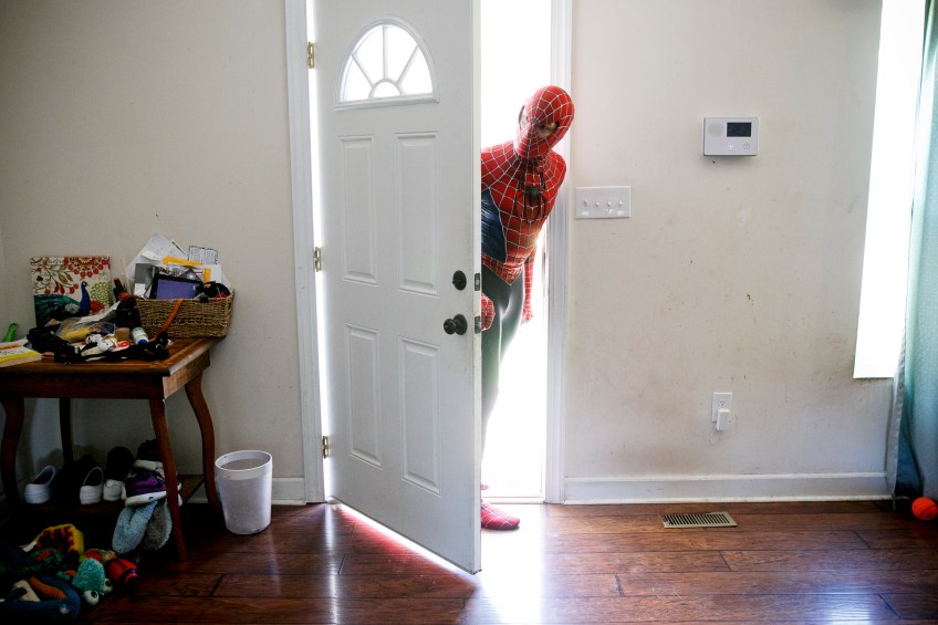Donald Traynham, of Williamsburg, Va., dressed as Spiderman, peers through the front door at the home of Zack Cissell, on Friday, September 22, 2017 before they left for a charity event they were performing at that evening. The duo, along with Chloe Bethune, are all members of the The Hampton Roads Superhero Squad.