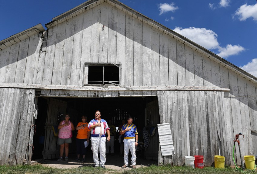 Rick Huffman, center, covers his heart during the playing of the national anthem as he gathers with others before the start of harness racing at the Clark County Fair on Sunday July 30, 2017 in Kahoka, MO. The fair, which began in 1881 featured a demolition derby, tractor pull, and livestock competitions among other attractions. There used to be several days of harness racing at the fair in the past, this year it was on one day. Huffman was competing in the racing.