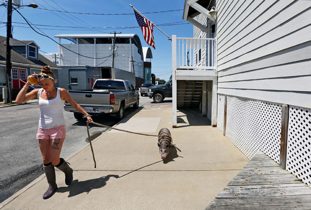 First Hand Stasia Hudson, walks along the sidewalk with Pig as she waits for the boat to be unloaded at L D Amory & Company fish market in downtown Hampton. The 1 1/2-year-old potbelly pig is the resident pet of the ship and lives on the Carol Ann, a longline fishing boat, with the crew members while at sea. Wednesday, June 21, 2017.