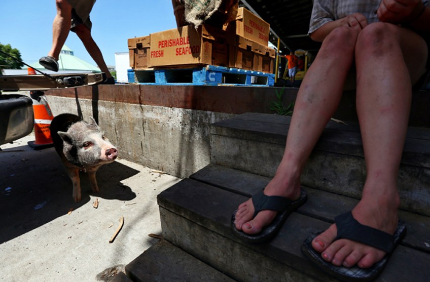 An employee with L D Amory & Company unloads a delivery truck as the potbellied pig named Pig hangs out in the shade from underneath a truck. Samantha Huff, left, from Charleston Sc., sits on the steps, watching over Pig, as the crew’s longline fishing boat is unloaded in downtown Hampton. Wednesday, June 21, 2017.