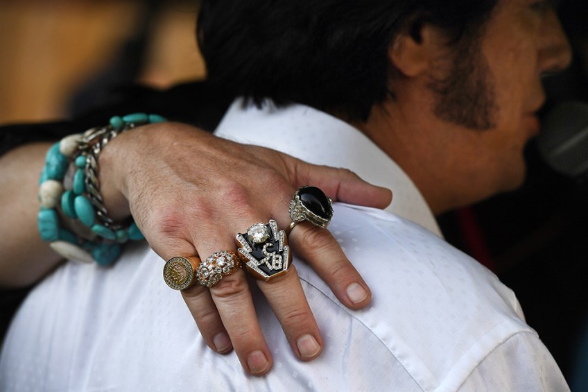 Elvis Tribute Artists, Brett LeSueur, of Knoxville, TN puts his arm around fellow tribute artist, Travis Albertson, of Austin, IN as they perform in the backyard of Bud and Mary Stonebraker on Friday August 11, 2017 in Memphis, TN. The couple have lived directly behind Elvis Presley’s Graceland for 22 years. Bud refers to he and his wife as more Elvis fanatics than just fans. Their house is decked out with Elvis memorabilia. They hosted free concerts in their backyard during Elvis Week.