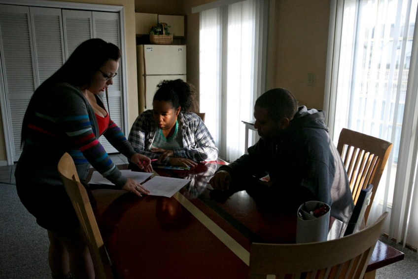 After many days of scrambling to find housing, Julissa Sosa and her fianc, Phillip Barada, go over paperwork for their new apartment with a leasing agent at the complex. Finding an apartment that fit within their budget, had a good school zone, and that had immediate vacancy was a challenge for the family.