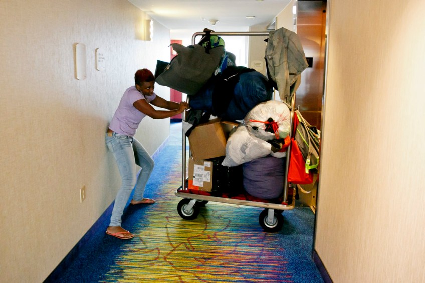 Diamond Gilmore moves her and her 3-year old son’s belongings out of her hotel room and into Julissa and Phillip’s room on Wednesday, November 2, 2016. Although the apartment’s management company originally helped displaced families with hotel expenses, the time had run out and Diamond needed a place to stay.