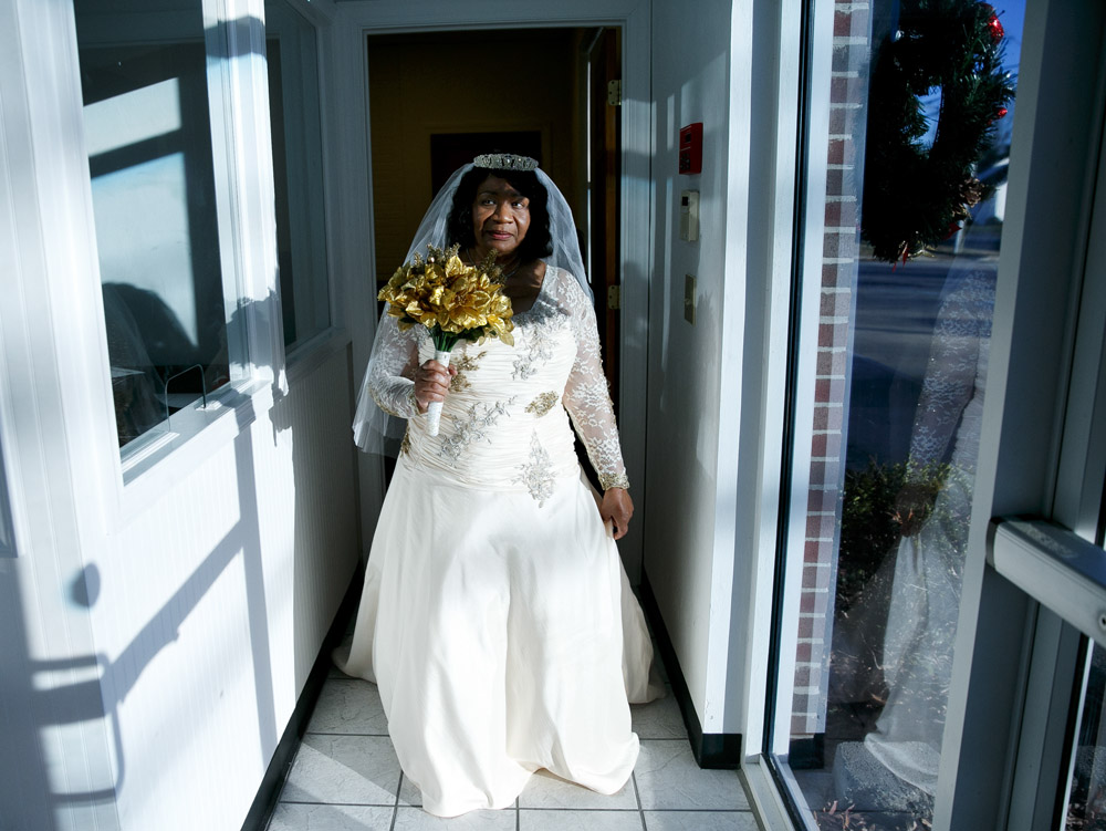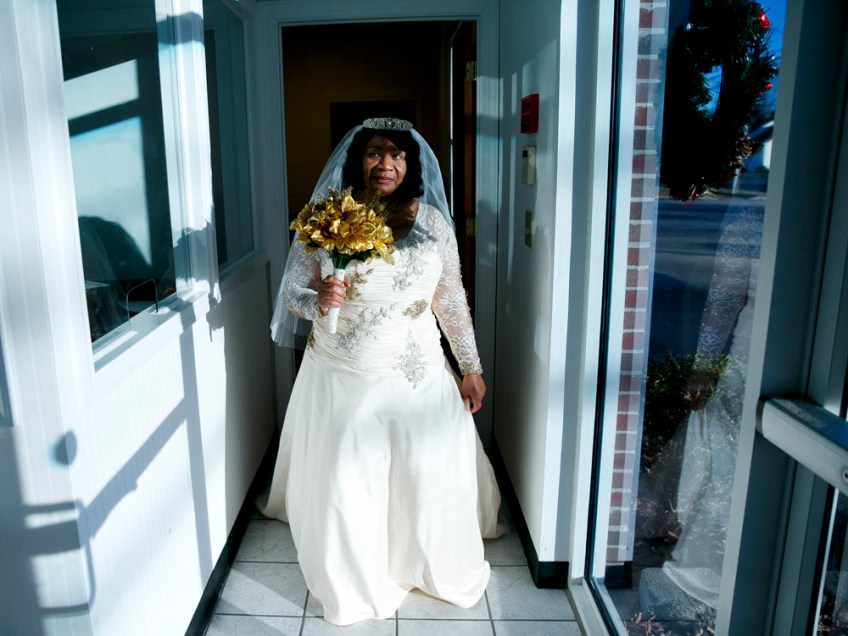 Bride Elizabeth carefully walks around the corner so as to not reveal her dress to groom, Arthur Lawrence Sr., prior to the start of their wedding at New Weeping Mary Missionary Baptist Church in Chesapeake, Va., on Saturday, December 10, 2016. The couple has been married for 50 years but due to LawrenceÕs military career, they were unable to have a planned wedding and married in a quick ceremony in 1966. Lawrence’s daughter, Elizabeth Coleman, planned a wedding for her parents.