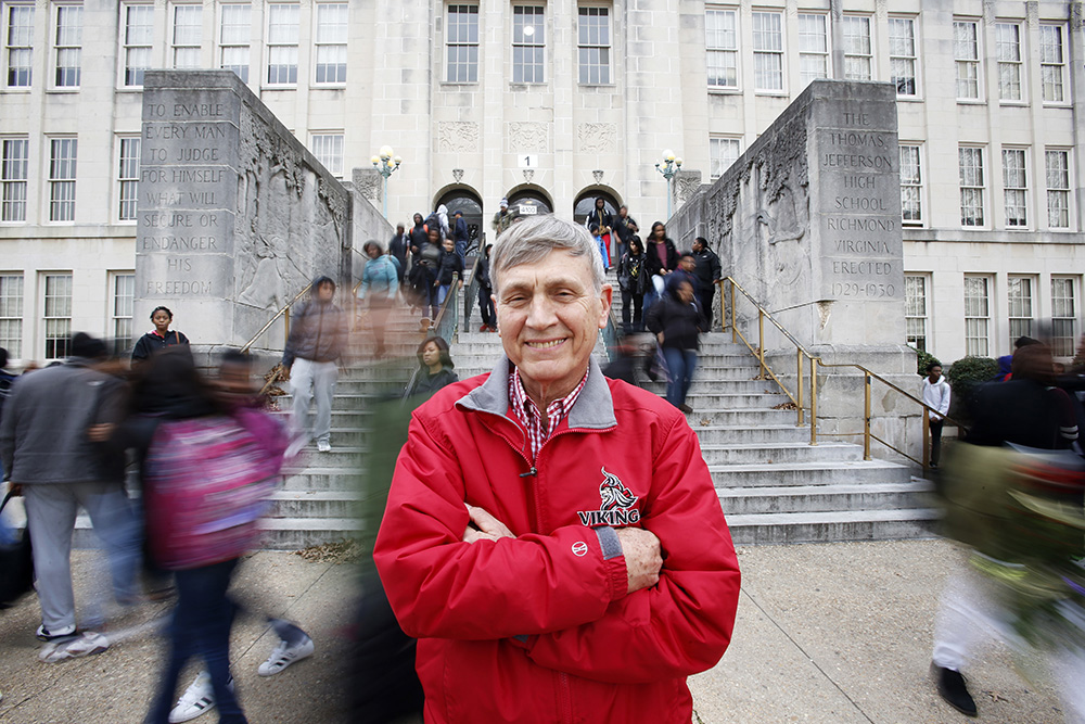 Russell Flammia was a Thomas Jefferson High School graduate, then taught at the school as a teacher for 34 years and now continues to volunteer with the Thomas Jefferson students. He stands outside of the high school he graduated from, as students stream out after the final bell on Wednesday Dec. 14, 2016.