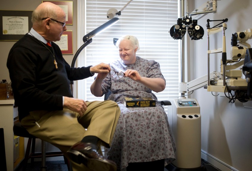 2nd Place Feature Picture Story: Erica Yoon, Roanoke Times–Tonya Davison, 36, of Blackstone, Va., tries on her new reading glasses at Dr. David Armstrong’s office in Roanoke on Monday, Dec. 21, 2015. “I’ve never been able to see my own face in the mirror,” Davison said, who has low vision. Davison heard about Dr. Armstrong through a recommendation from another optometrist, Dr. Kingsley of Farmville. Davison wanted help with reading, depth perception and far sightedness.