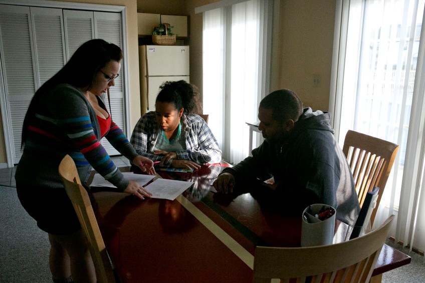 After many days of scrambling to find housing, Julissa Sosa and her fiancŽ, Phillip Barada, go over paperwork for their new apartment with a leasing agent at the complex. Finding an apartment that fit within their budget, had a good school zone, and that had immediate vacancy was a challenge for the family.