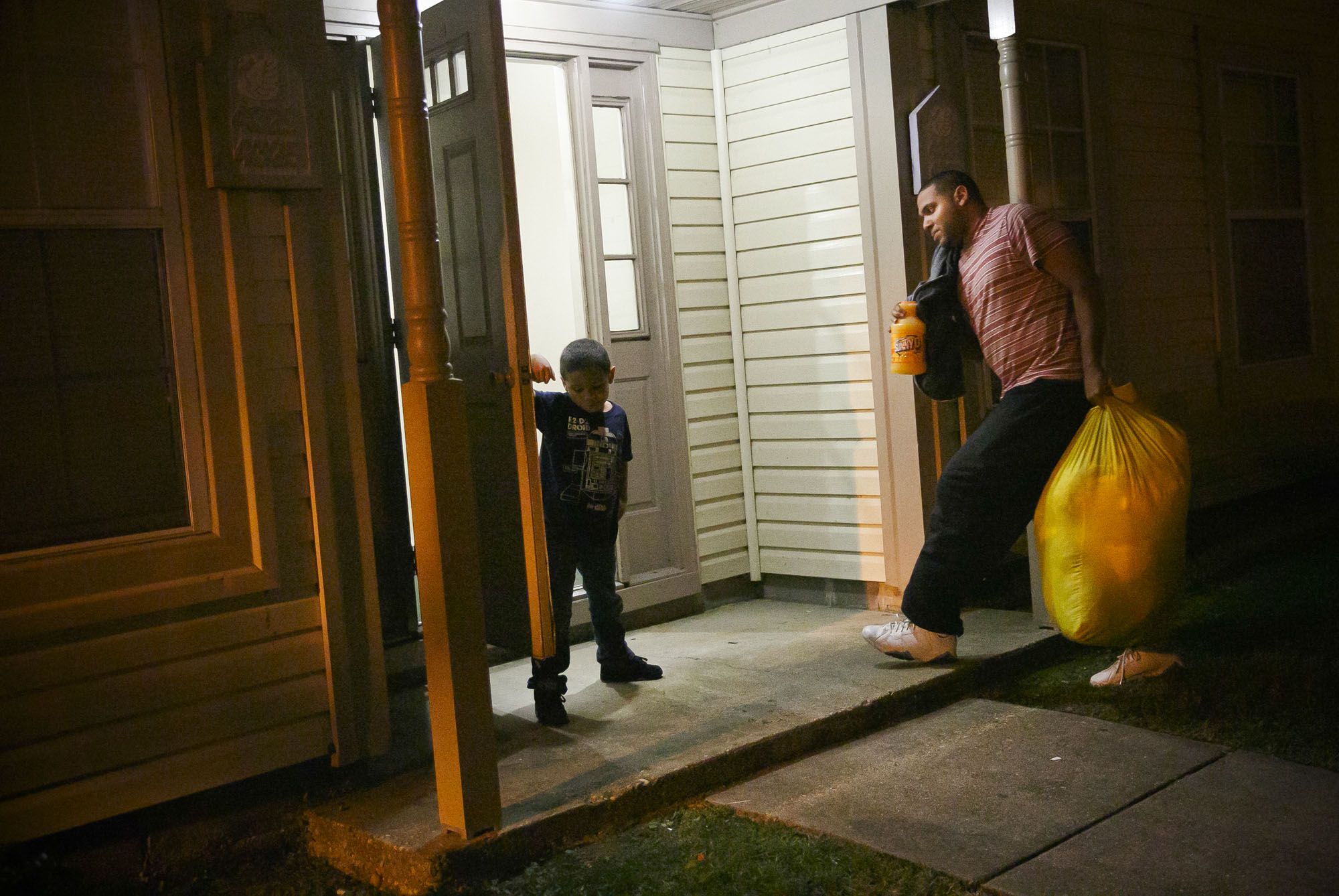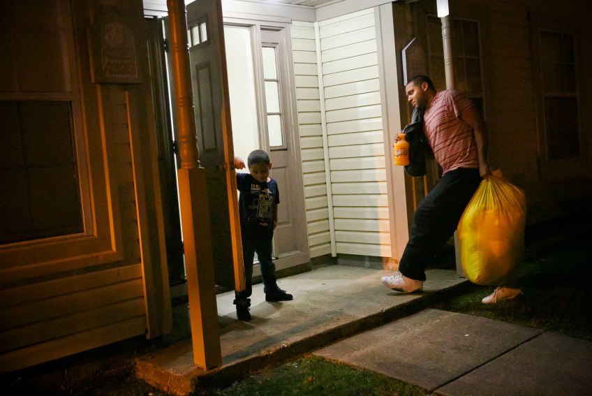 Julian Barada, 4, holds the door for his dad as they move what is left of their belongings into their new home late on Thursday, November 3, 2016. “I’ve worked so hard to provide the things I have for my family, I just want my couch,” said Barada. The family had recently saved money to buy a new couch that’s currently still sitting in their old apartment, along with all of their other belongings that they’ve been barred from returning to get.