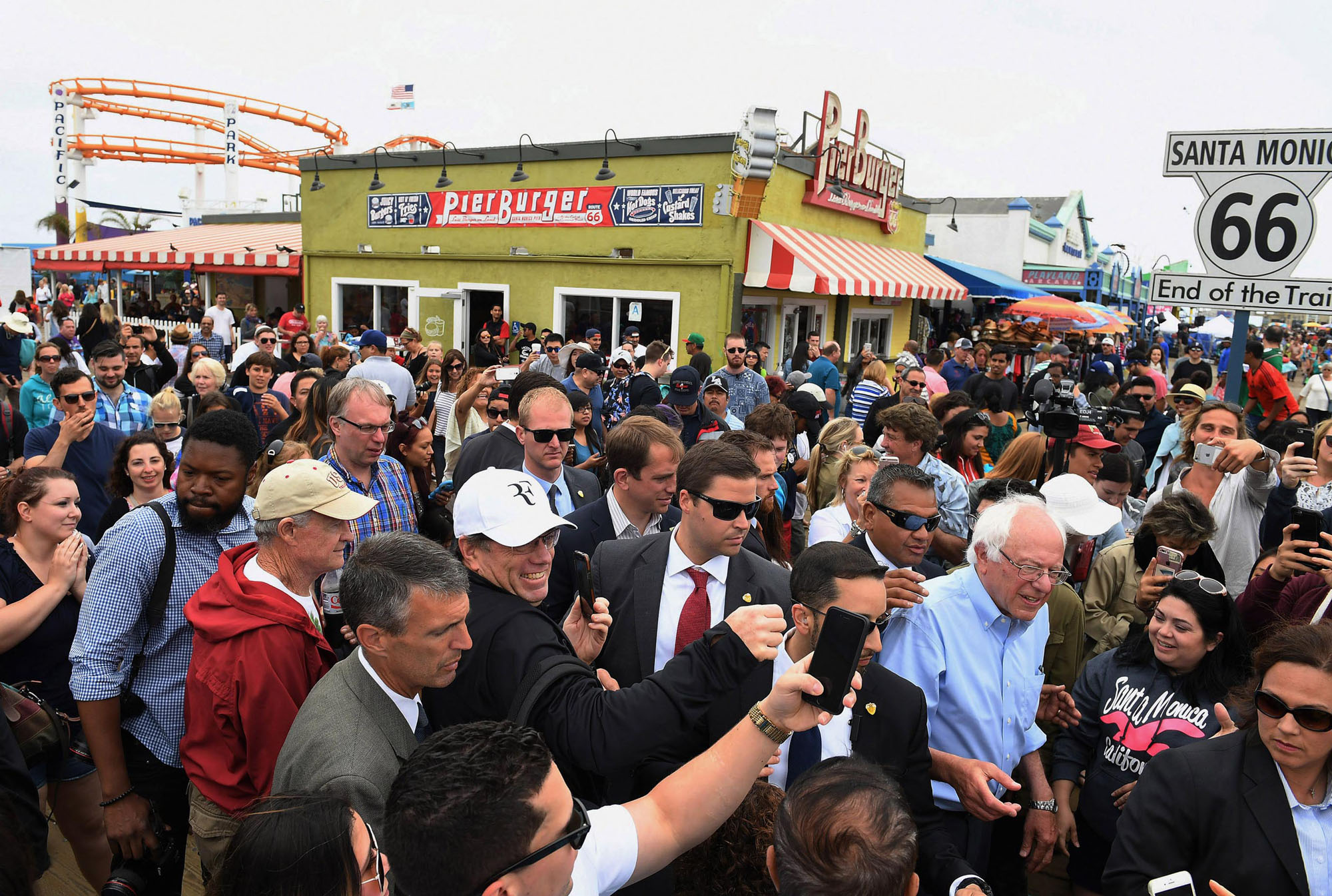 Presidential candidate, Bernie Sanders greets people at the Santa Monica Pier on Sunday June 05, 2016 in Santa Monica, CA. The primary in California is June 7th. He campaigned heavily in California, but ultimately lost the primary. He worked with Hillary Clinton to shape the Democratic platform going into the general election.