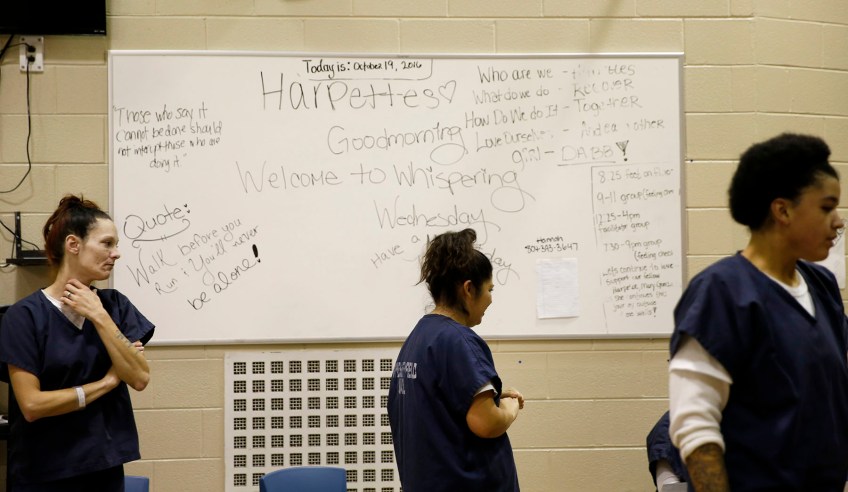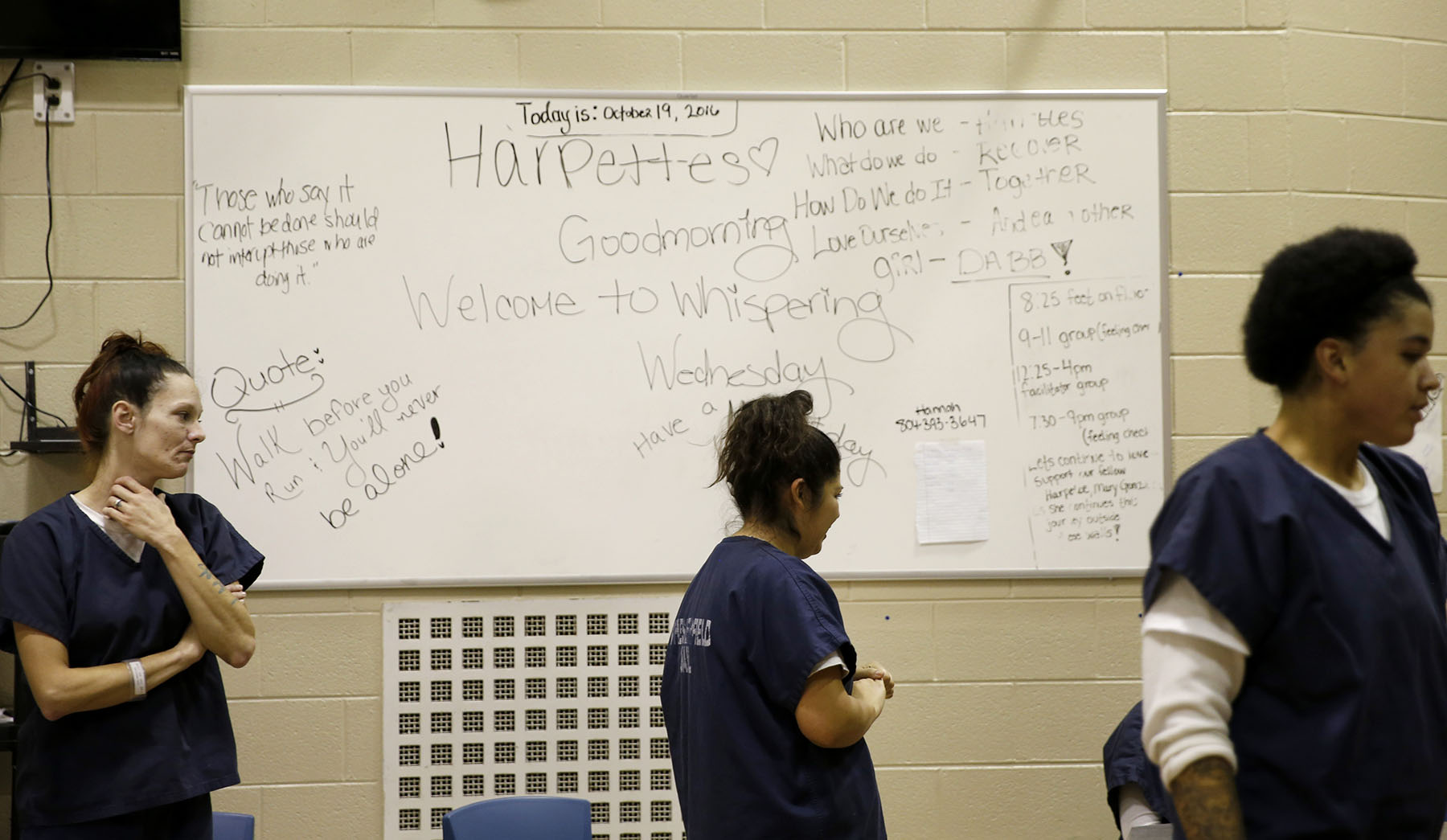 nps-005-jail04 Published March 26, 2017 at 1800 × 1045 in 2016 Photos of the Year. News Picture Story… (From left) Amanda Lewis, Dalila Rodriguez and Madlyn Ward walk around the common area of their pod at the Chesterfield County Jail on Oct. 19, 2016. The board in the common area includes recovery quotes and their motto.