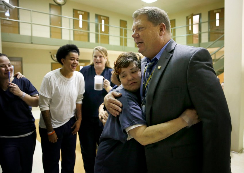 Tomme Pantoni hugs Sheriff Karl Leonard after he said he would try and bring in a tattoo artist to the pod at the Chesterfield County Jail to tattoo “Harpettes” on the women who wanted it on Oct. 19, 2016. Pantoni and the other women are part of an opioid program in the jail. The program started with the men and was called HARP for Heroin Addiction Recovery Program. The women have dubbed themselves the “Harpettes.”