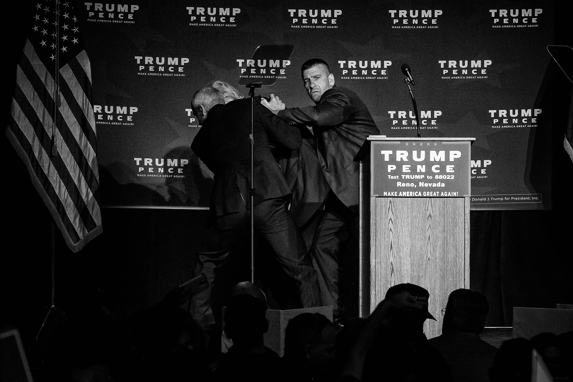 After somebody in the crowd yelled ‘gun’ while scuffling with a protester, US Secret Service agents rush Donald J. Trump offstage amid a chaotic scene at a campaign rally Saturday, Nov. 5, 2016 at the Reno-Sparks Convention Center in Reno, NV. No gun was ever recovered and the protester was not charged for any crime.