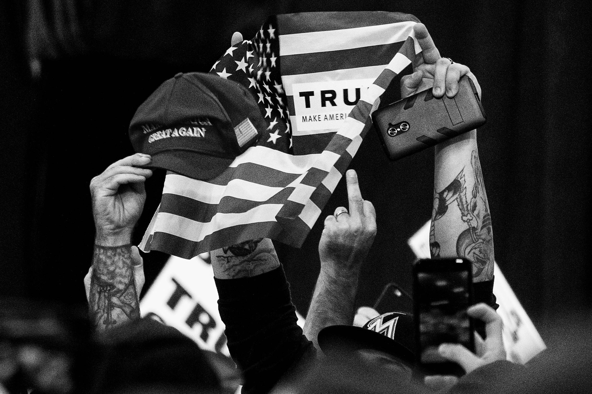 Trump: All In Published March 26, 2017 at 2000 × 1333 in 2016 Photos of the Year. News Picture Story… Supporters of Republican presidential candidate Donald J. Trump offer a rude gesture to members of the media during a campaign rally Nov. 7, 2016 at the Sarasota Fairgrounds in Sarasota, Florida.