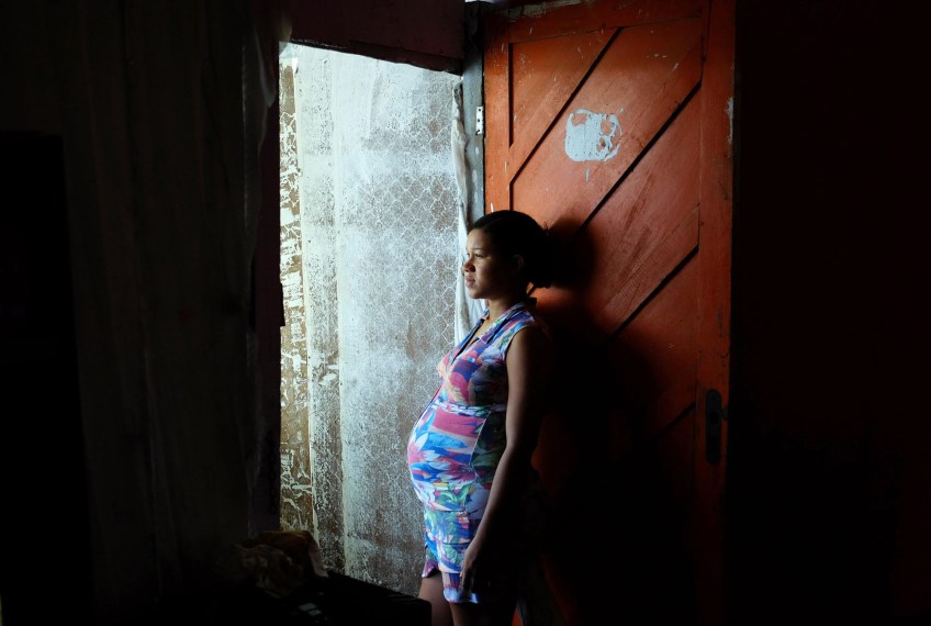 Jessica Thalia Cruz Menezes poses for a portrait at her home in a community along the water on Sunday March 13, 2016 in Recife, Brazil. Jessica is eight months pregnant and has had no signs of the Zika virus. The Zika virus has been rampant in this region. The virus is spread by the Aedes aegypti mosquito. Trash and stagnant water are breeding grounds for mosquitos.
