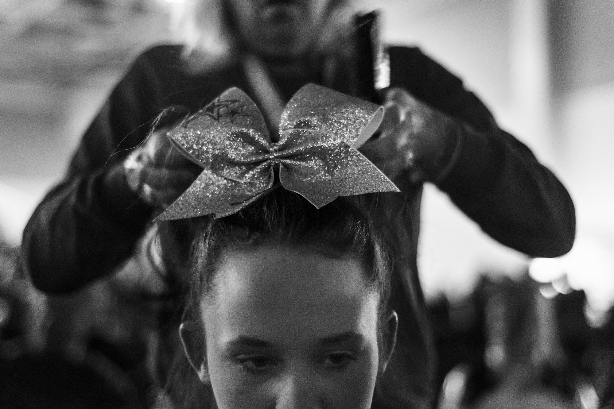 Haley Coleman, 15, gets her hair done by Angela Hamilton before the Dynamic Cheer Super Stars perform at the Cheer and Dance Extreme Finale on Saturday April 9, 2016 in Virginia Beach, VA. “The girls care for each other,” said Hamilton, whose 13-year-old daughter, Kirsten, is on the team. “They take cues from one another. They know when somebody’s having a good day. They know when somebody’s having a bad day.”