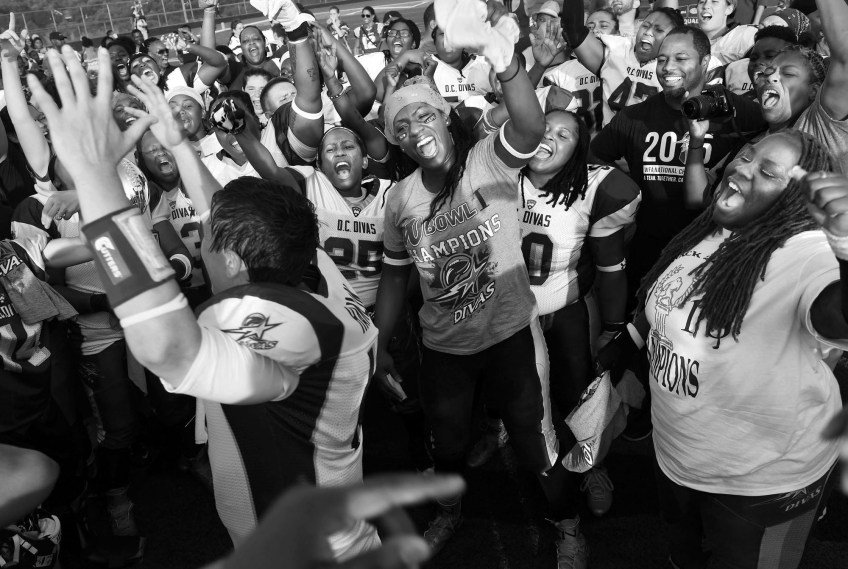 Tia Watkins, center, celebrates with teammates following the Women’s Football Alliance championship game or W Bowl against the Dallas Elite at West Allegheny High School on Saturday July 23, 2016 in Imperial, PA. Tia plays for the D.C. Divas, a full-contact female football team. The Divas won the game.