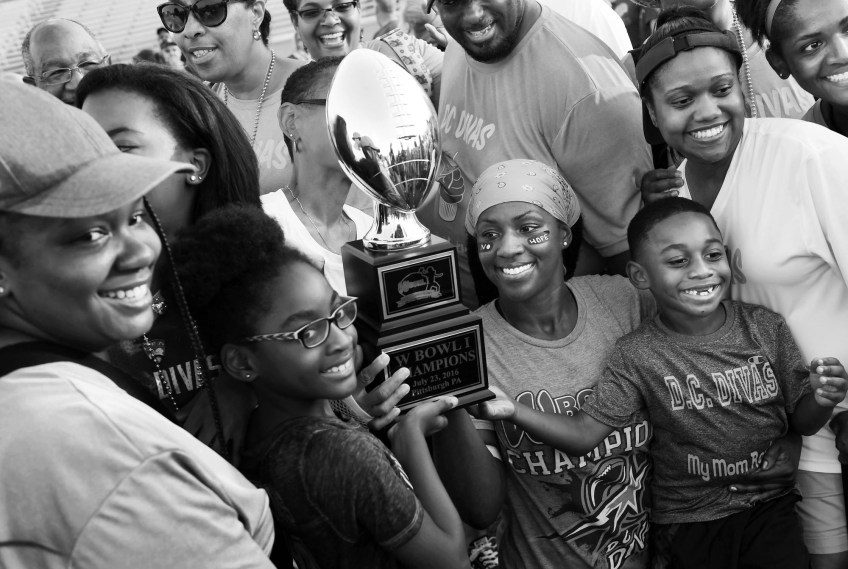 Tia Watkins, right, poses for a photograph with family and friends following the Women’s Football Alliance championship game or W Bowl against the Dallas Elite at West Allegheny High School on Saturday July 23, 2016 in Imperial, PA. Tia plays for the D.C. Divas, a full-contact female football team. The Divas won the game.