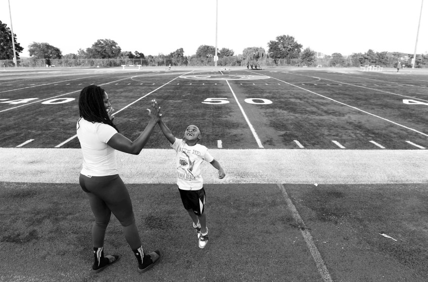 Tia Watkins plays with her son, Shawn Watkins Jr. before her football practice with the D.C. Divas at Spingarn High School on Wednesday July 20, 2016 in Washington, DC. The D.C. Divas is a full-contact female football team. Among the things that motivate her to play a sport not widely known as