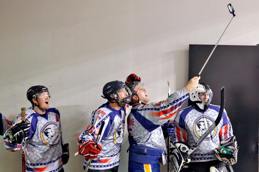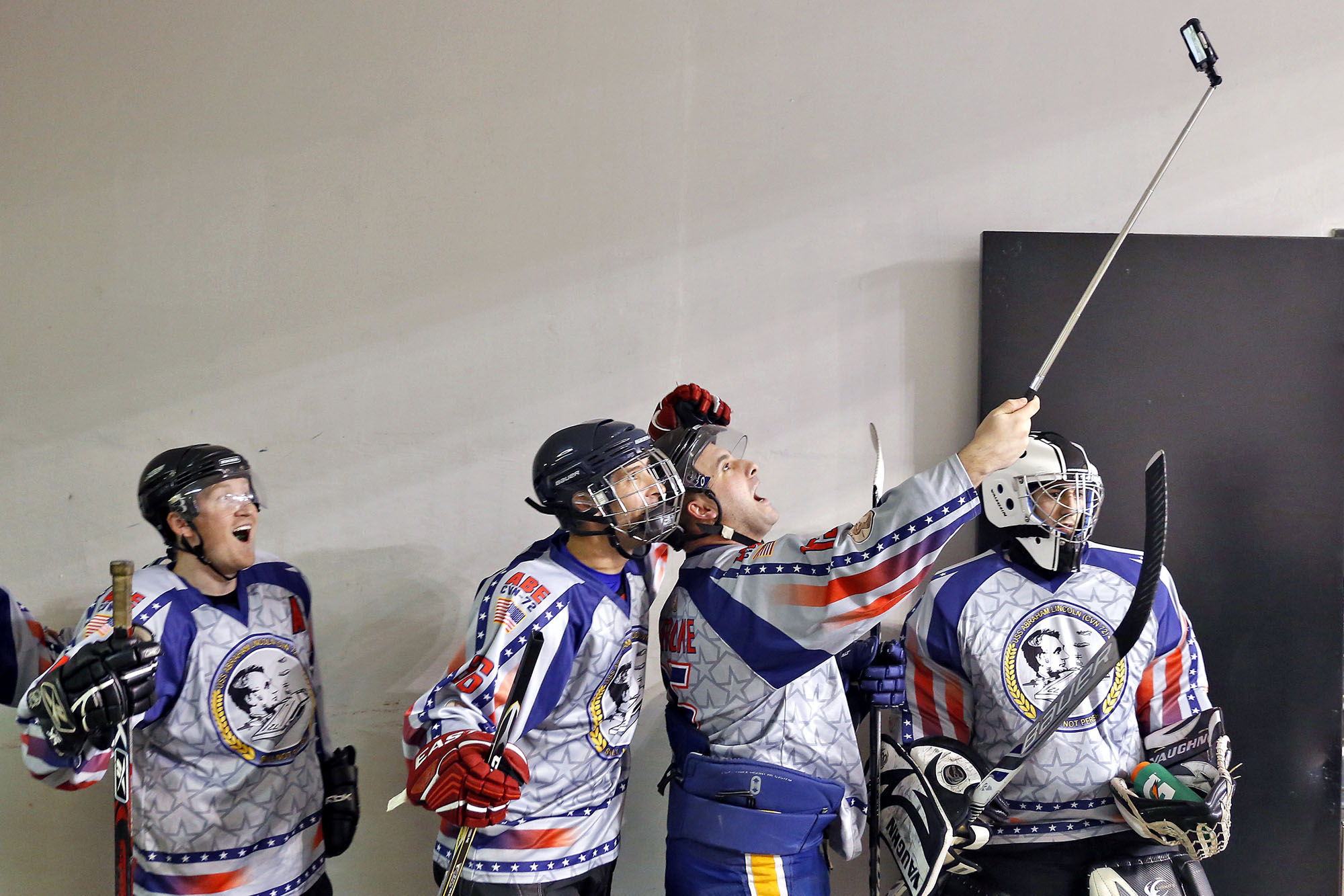 airVSsea2 Published March 26, 2017 at 2000 × 1333 in 2016 POY Virginia Winners. Singles Categories… 1st Place Sports Feature: Jonathon Gruenke, Daily Press–Members of the USS Abraham Lincoln hockey team take selfies before the start of Saturday’s Air vs. Sea hockey game at the Scope Arena in Norfolk on January 30, 2015.