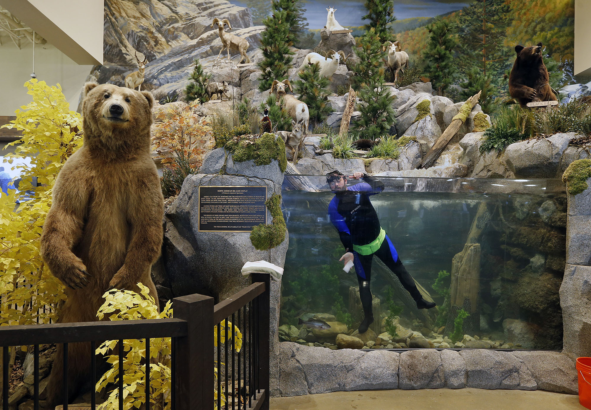 env-009-NatureRetail01 Published March 26, 2017 at 2000 × 1390 in 2016 POY Virginia Winners. Singles Categories… 1st Place Environment: P. Kevin Morley, Richmond Times-Dispatch–Robert Michael cleans the large aquarium at Cabela’s, in the North American Big Game Display in the new outdoor gear and hunting supply retailer set to open April 6. March 22, 2016