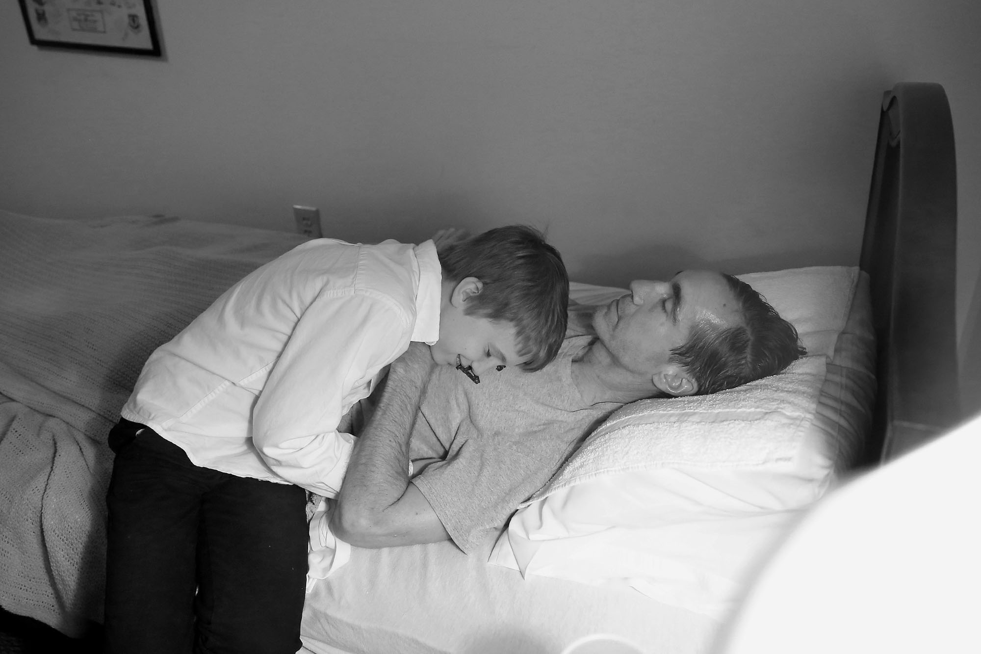 1st Place Lifestyle: Jonathon Gruenke, Daily Press–Bradley Garner hugs his father, Jim, as he lies in bed at Commonwealth Assisted Living in Hampton Thursday evening March 24, 2016. Jim died from Alzheimer’s April 2, 2016. Jim was diagnosed by the National Institute of Health in 2011 with “mild cognitive impairment,” the precursor to early-onset Alzheimer’s disease. The genetically pre-determined disease has devastated his family–his mother died of the disease at age 61, his older brother at 52.