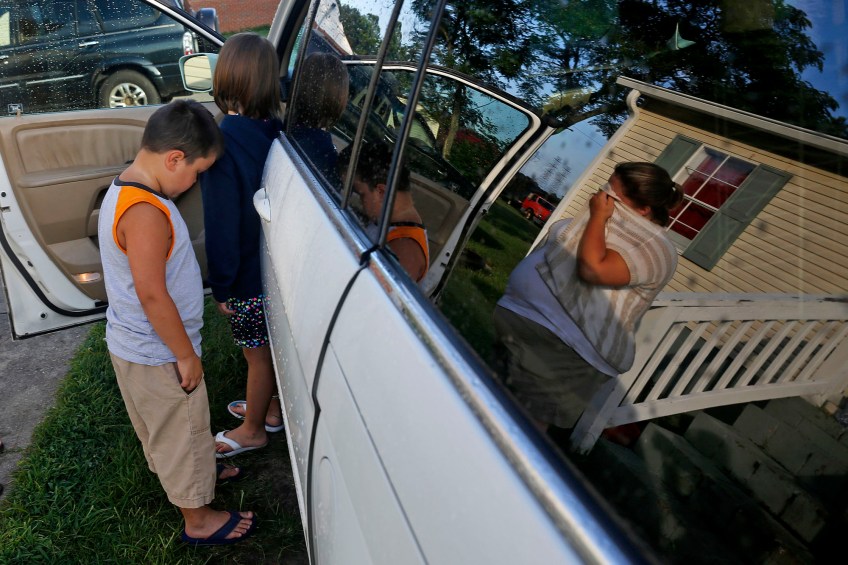 2nd Place General News: Jonathon Gruenke, Daily Press–Jessica Leitch, right, begins to cry as Benjamin Leitch, left, and Gracelyn Leitch enter the family’s van Sunday morning July 17, 2016 to move to Missouri from Smithfield. Jessica is leaving behind her husband John Leitch in hopes of finding better special education for Benjamin.