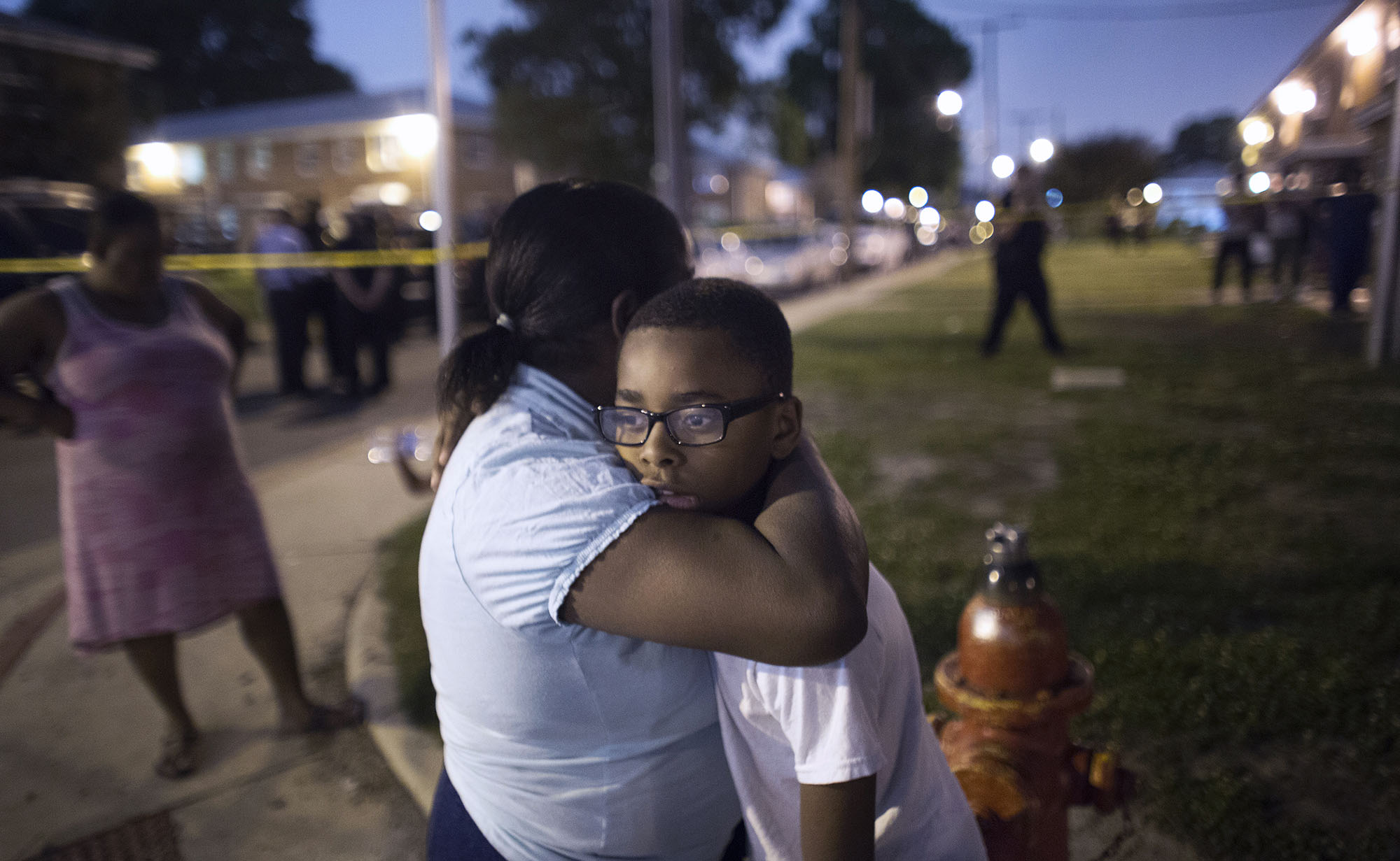 2nd Place Spot News: Todd Spencer, Virginian-Pilot–Melody Spraggin holds her ten year old son Mark Spraggin outside a residence in the Tidewater Gardens neighborhood, where Norfolk Police say two officers were involved in a fatal shooting inside. Melody said that the man shot was her uncle and she was waiting for information from the police.